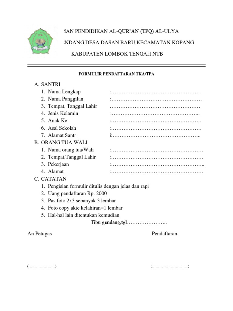 Contoh Formulir Pendaftaran Santri Tpq : Tkit Tpq Baitul Aini Contoh Formulir Pendaftaran Siswa Baru Paud Tk Tpq Dilengkapi Foto : Berikut contoh logo tpq yang sudah jadi dan logo tpq yang tinggal di isi nama dan alamat tpq.